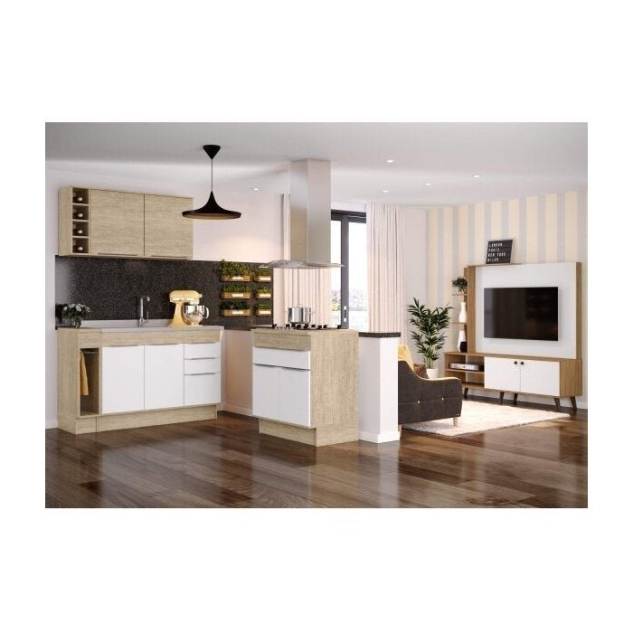 Cozinha Modulada Integrada com Sala de Estar Havanna Espresso Móveis Acácia/Branco/Naturalle