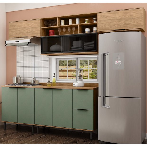 A Cozinha Modulada Toscana em MDF 5 peças com Aereo 1200 Porta de Vidro e Aereo Geladeira com tampo da MX Móveis possui nichos ótimos para sua organização. Agora você pode guardar todos os seus utensílios de cozinha para desfrutar um jantar com a família. O acabamento externo e interno, é de total qualidade, utilizando o melhor material, para que seja feito um excelente trabalho, visando também, nosso maior bem, a natureza, com processo ecologicamente corretos.