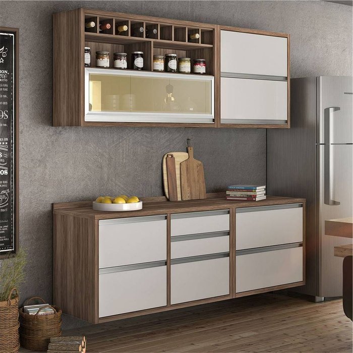 Esse modelo é composto por armários e prateleiras suspensos na parede, o que ajuda a aproveitar melhor a área disponível na cozinha.