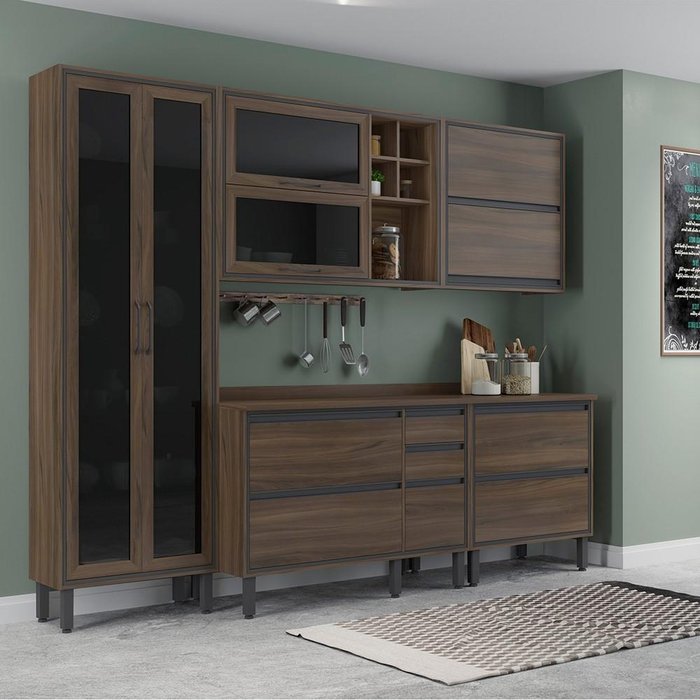 Cozinha Planejada 5 Peças Cristaleira Portas Vidro Marrom