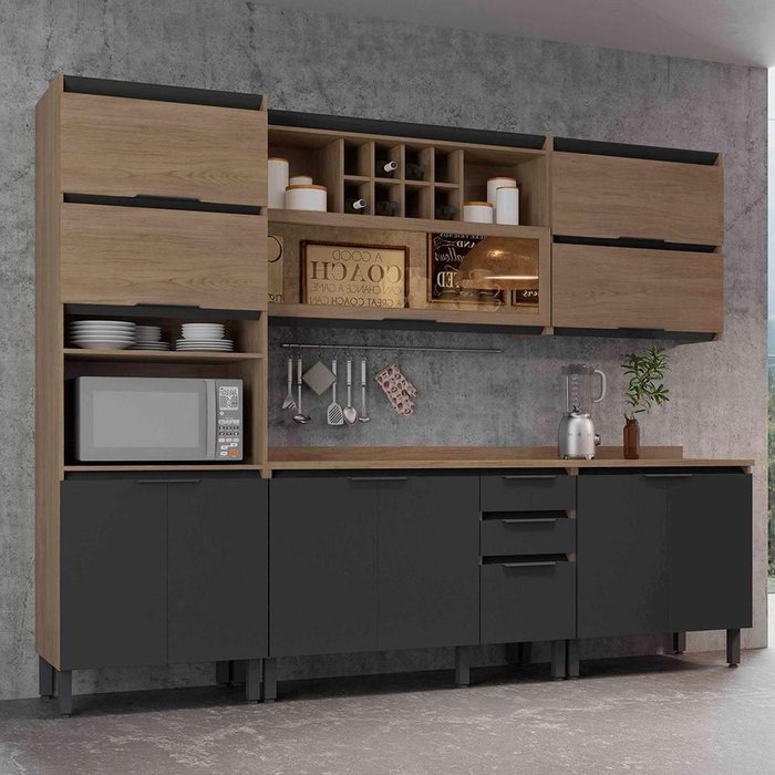 Cozinha Completa Planejada Compacta 5 Peças Organizadora Porta Basculante Com Vidro Marrom Aveiro