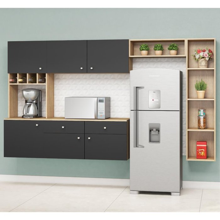 Esse modelo é composto por armários e gavetas que oferecem espaço suficiente para armazenar utensílios de cozinha e eletrodomésticos.