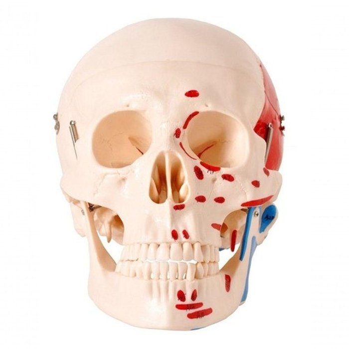 Ossos da face: Nasais, Maxilas, Lacrimais, Zigomáticos, Palatinos, Conchas nasais inferiores, Vômer, Mandíbula. O modelo TGD-0102-M permite: Visualizar suturas e forames cranianos. Através da abertura da calota craniana, é possível visualizar estrutura da base do crânio. Realizar movimento mandibular. O estudo das regiões de origem muscular que estão coloridas no modelo e classificadas no manual do usuário. Acompanha: Manual do usuário