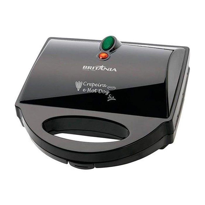 A Crepeira Six Britânia faz 6 crepes de uma só vez, mais agilidade na hora do preparo. Prepara crepes doces e salgados, é versátil no preparo de diversos sabores, também prepara queijo coalho e hot dog no palito. As chapas possuem revestimento antiaderente evitando que as massas grudem na superfície e facilita a limpeza. A trava de fechamento e base antiderrapante dá maior segurança durante a utilização. Luzes indicadoras de funcionamento e aquecimento permite saber quando o produto está em funcionamento. Pode ser guardada na posição vertical mais facilidade para armazenar o produto.