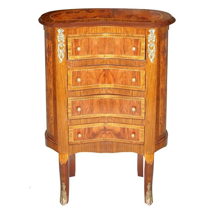 Criado-Mudo, hoje uma peça indispensável na maioria dos quartos, tem a função principal de ser um porta objetos, podendo ter características de móveis sofisticados como provençal, Luix XV, Vitoriano, etc. Criado em carvalho, madeira especifica para produção de moveis de alta qualidade que resiste a umidade, revestido em verniz, com ornamentos em bronze polido, e desenhos em marchetaria feito manualmente em folhas de radica. Medidas: 80 x 45 x 30 cm. Utilize lustra-móveis e pano umedecido para conservar o brilho da peça, não usar produtos químicos muito agressivos para conservação do móvel.