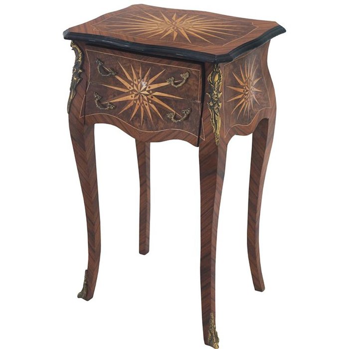 Criado-mudo em madeira de alta qualidade que resiste a umidade, revestido em verniz, com ornamentos em bronze polido, desenhos em marchetaria feito manualmente em folhas de radica.