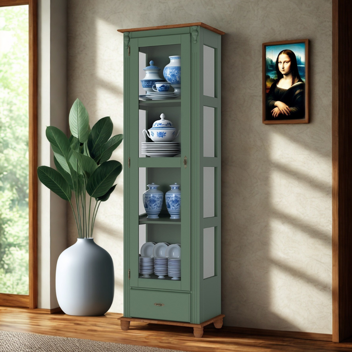 Cristaleira 1 Porta 1 Gaveta 3 Prateleiras Pés Torneados - Verde Kalle com Tampo e Base Imbuia Glaze Verde