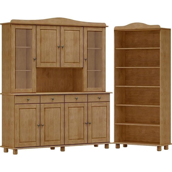 Cristaleira e Estante Livreiro, um conjunto projetado para quem busca móveis que combinam elegância e funcionalidade para complementar sua decoração. Produzido em madeira maciça de pinus de reflorestamento, sua estrutura robusta garante durabilidade e resistência. A Cristaleira de 168,9cm de largura, conta com 08 portas sendo 02 de vidro incolor, que possuem dobradiças com amortecimento. As gavetas com corrediças telescópicas proporcionam abertura suave e máxima praticidade para guardar itens menores, enquanto os puxadores metálicos adicionam um toque moderno ao design clássico do produto. Com amplo espaço para organização, a Estante de 85cm de largura é perfeita para acomodar livros, objetos decorativos ou itens de sua preferência. Ambos os móveis possuem pintura acetinada com verniz PU e UV, que realça a beleza natural da madeira enquanto protege contra desgastes do dia a dia, e pés torneados em madeira maciça que garantem estabilidade e charme artesanal. Estes móveis chegarão em sua casa separados em 04 volumes.