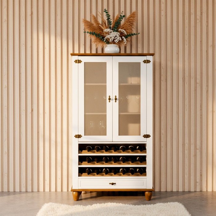 Cristaleira Adega Alta 2 Portas 1 Gavetas Tampo Base e Pés em Madeira Maciça Joy Off White