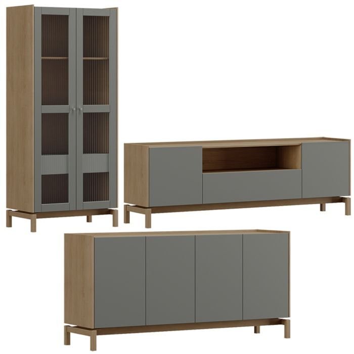 O conjunto Cristaleira, Balcão Buffet e Rack une sofisticação, funcionalidade e resistência em peças que se complementam com harmonia. Todos são produzidos em madeira maciça de pinus de reflorestamento, com acabamento em pintura acetinada PU e UV que valoriza o visual e garante durabilidade. O balcão buffet, com 165 cm de largura, conta com tampo e frentes de portas e gaveta em MDF, 1 gaveta com corrediças telescópicas e 2 prateleiras internas, sendo ideal para a organização de objetos no seu ambiente. A cristaleira, com 80 cm de largura, possui 2 portas com vidro canelado incolor, dobradiças com amortecimento, 1 gaveta interna com corrediças telescópicas e 2 prateleiras em madeira maciça, perfeita para expor itens com elegância. Já o rack, com 180 cm de largura, conta com tampo, frentes de portas e gaveta em MDF, 2 portas, 1 gaveta com corrediças telescópicas, 2 prateleiras internas e dobradiças com amortecimento, além de suportar TVs de até 65 polegadas, sendo uma excelente escolha para compor sua sala com estilo e praticidade. Todos os móveis possuem pés flutuantes que conferem um toque moderno ao conjunto. Estes móveis chegarão em sua casa separados em 05 volumes.