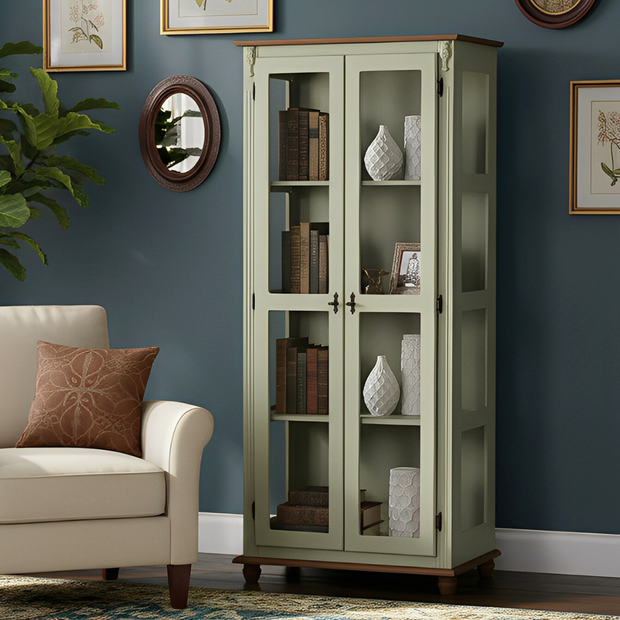 Cristaleira Colonial de Madeira 2 Portas com Pés Torneados - Verde Chá com Tampo e Base Imbuia Glaze Verde Chá