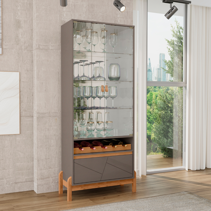 Cristaleira Cristal Espelho Adega 2 Portas Vidro Temperado Sala de Estar e Jantar com Pés Madeira Ma