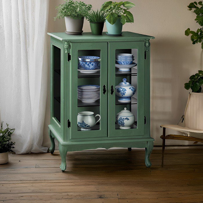 Cristaleira de Madeira 2 Portas 1 Gaveta Vidros e Espelho Pés Luiz Xv - Verde Kalle Laca