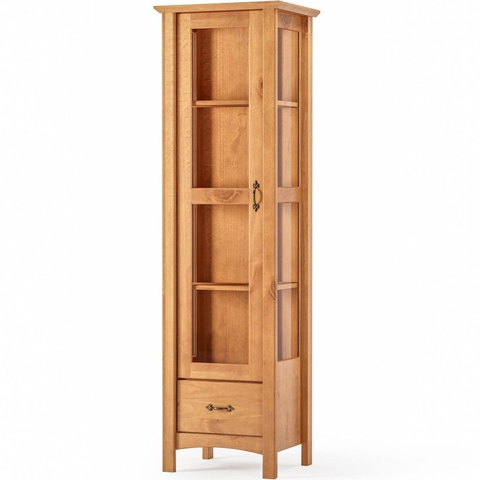 A Cristaleira é feita em Madeira de Pinus de Reflorestamento, 100% Maciço, e acabamento em verniz fosco. A Cristaleira de Madeira conta com 1 porta de vidro com dobradiças de pressão, 1 gaveta com corrediças telescópicas e puxadores em metal na cor ouro envelhecido.
