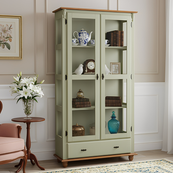 Cristaleira de Madeira Maciça 2 Portas 1 Gaveta e Pés Torneados - Verde Chá com Tampo e Base Imbuia