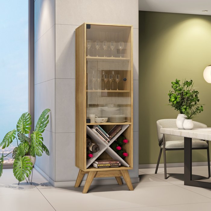 Com estilo retrô a Cristaleira Graça é o complemento ideal para organizar e deixar sua sala de jantar mais aconchegante. Produzida em MDP 15mm, Porta em vidro temperado, Adega decorativa, Pés em madeira maciça.