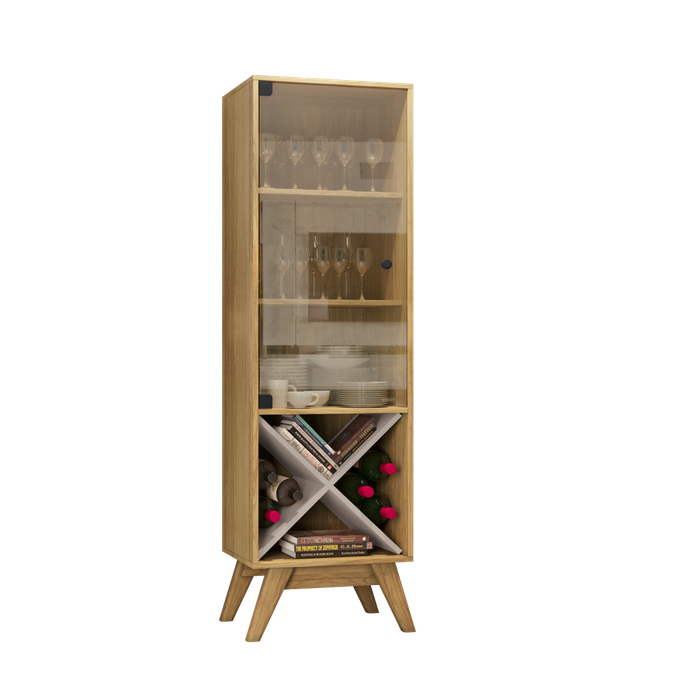 Com estilo retrô a Cristaleira Graça é o complemento ideal para organizar e deixar sua sala de jantar mais aconchegante. Produzida em MDP 15mm, Porta em vidro temperado, Adega decorativa, Pés em madeira maciça.