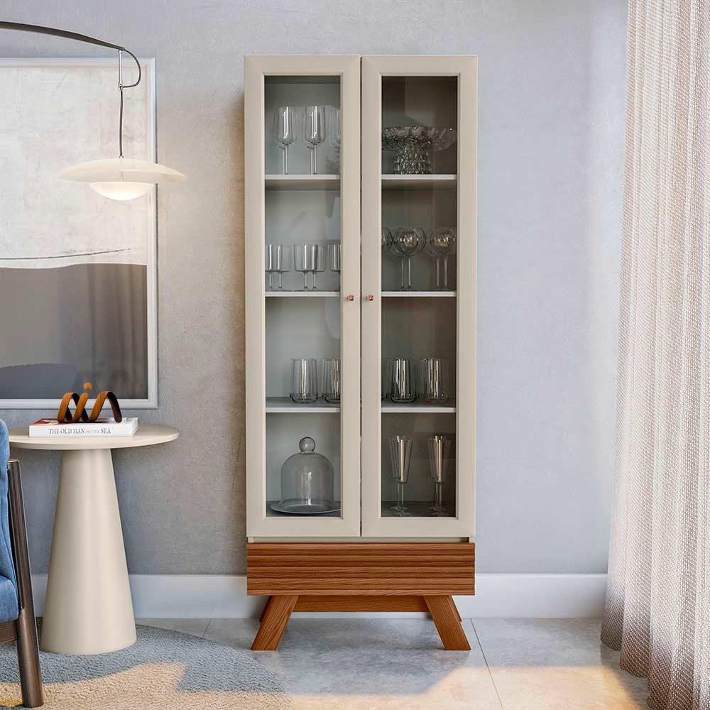 Cristaleira Retrô Americana Portas de Vidro e Gaveta com Detalhe Ripado Freijó/off White Spazio