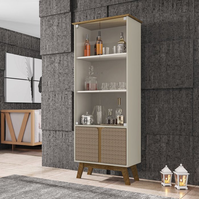 Cristaleira Retrô Portas de Vidro Fecho Magnético Pés Madeira Madri Móveis Bechara Off White/Cinamomo