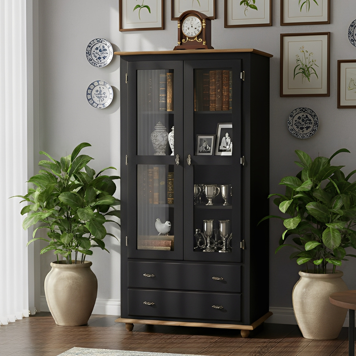 Cristaleira Rústica de Madeira 2 Portas e 2 Gavetas com Pés Torneados - Preto Laca com Tampo e Base