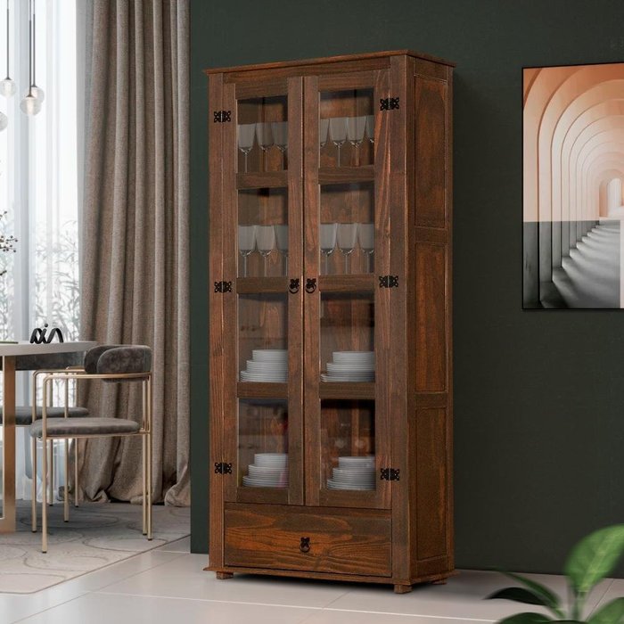 Cristaleira Rústica Madeira Maciça 2 Portas Vidro 1 Gaveta Imbuia Classic Shop JM