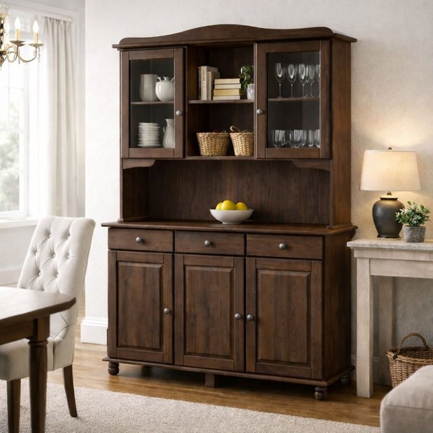 Seu estilo clássico valoriza os detalhes artesanais, como os entalhes sutis, os pés torneados e as portas envidraçadas, que permitem expor louças, taças e objetos decorativos com elegância. O conjunto cria uma atmosfera acolhedora, trazendo a sensação de mobiliário definitivo, feito para atravessar gerações.
