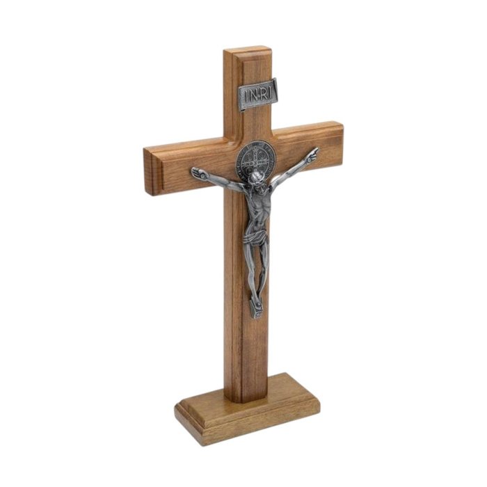 Crucifixo Cruz Medalha de São Bento Prateado Parede e Mesa 26 Cm