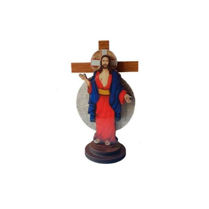 Crucifixo das Santas Chagas de Mesa 18 cm Crucifixo das Santas Chagas de madeira para mesa 18cm de altura Origem da Devoção das Santa Chagas de Jesus É uma devoção muito antiga e tradicional da Igreja. Ela nasceu na Santa Cruz, no grande ato de amor, quando Jesus se entregou e sobre o madeiro levou nossos pecados. A devoção às Santas Chagas dolorosas e gloriosas contempla exatamente a paixão, morte e ressurreição de Cristo. Principal propósito A Devoção das Santas Chagas de Jesus é principalmente de cura e libertação. Está na própria oração do Terço das Santas Chagas: “Eterno Pai, eu Vos ofereço as santas Chagas de Nosso Senhor Jesus Cristo; Para curar as de nossas almas”. Terço Santas Chagas de Jesus Cristo No início: Fazer o sinal da Cruz, rezar o creio e após… Oh! Jesus, Divino Redentor, tende Misericórdia de nós e do mundo inteiro. Deus Santo, Deus Forte, Deus Imortal, tende piedade de nós e do mundo inteiro. Graça, Misericórdia, Meu Jesus; nos perigos presentes, cobri-nos com Vosso preciosíssimo Sangue. Eterno Pai, tende Misericórdia de nós, pelo Sangue de Jesus Cristo, Vosso Filho Unigênito, tende Misericórdia de nós, Vos suplicamos. Amém. Contas grandes: Eterno Pai, eu Vos ofereço as santas Chagas de Nosso Senhor Jesus Cristo; Para curar as de nossas almas. Contas pequenas: Meu Jesus, perdão e misericórdia: Pelos méritos de Vossas Santas Chagas. Terminando o rosário, deve-se rezar três vezes: Eterno Pai, eu Vos ofereço as Santas Chagas de Nosso Senhor Jesus Cristo; Para curar as de nossas almas. Amém. Novena das Santa Chagas de Jesus + Suas Chagas Gloriosas + O Cristo Senhor me proteja e me guarde. Senhor Jesus, foste elevado na Cruz para que por Vossas Santas Chagas, sejam curadas as de nossas almas. Eu Vos louvo e agradeço pelo Vosso ato redentor. Carregaste em Vosso próprio corpo os meus pecados e de toda a humanidade. Nas Vossas Santas Chagas coloco minhas intenções. Minhas preocupações, ansiedades e angústias. Minhas enfermidades físicas e psíquicas. Meus sofrimentos, dores, alegrias e necessidades. Em Vossas Santas Chagas Senhor, coloco minha família. Envolvei Senhor a mim e meus familiares protegendo-nos do mal. (instante de silêncio)