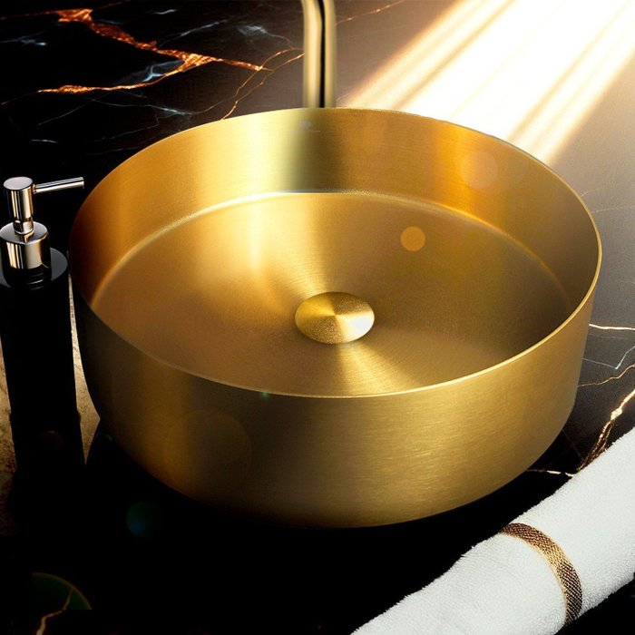 A Cuba Redonda em Aço Inox 304 Dourada traz sofisticação ao seu banheiro. Com 40 cm de diâmetro e 12 cm de altura, oferece alta resistência à corrosão e durabilidade. Sua pintura eletrostática dourada é anti-risco e anti-ferrugem, garantindo beleza e proteção duradoura. Acompanha válvula click dourada para fácil abertura e fechamento, além de sifão com sistema antiodor, proporcionando praticidade e conforto. Itens inclusos: Cuba de Aço Inox, Válvula Click Dourada, Sifão com sistema antiodor, Parafusos e Chaves. Garantia de 1 anos contra defeitos de fabricação.