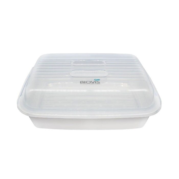 Conjunto com 3 peças: bandeja, escorredor e tampa.