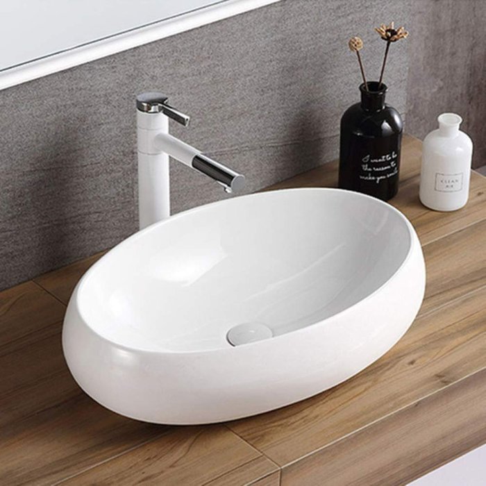 Sua pintura é esmaltada na cor branco brilhante. Este modelo possui forma oval, ideal para móveis compridos e estreitos.