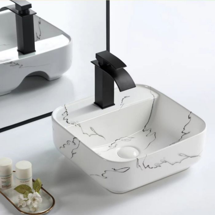 Sua pintura é esmaltada na cor marmorizada brilhante. Este modelo apresenta formato quadrado, se encaixando facilmente em vários modelos de bancada.