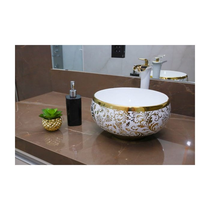 Cuba de Apoio em Cerâmica para Lavabos e Banheiros - Branca e Dourada - Premium - LMS-MK-1080GF