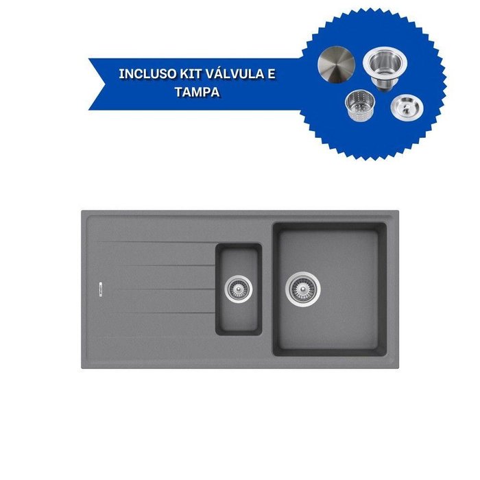 Cuba De Cozinha Em Quartzo Arell 203E + Válvula Cinza/Inox Cinza/Inox