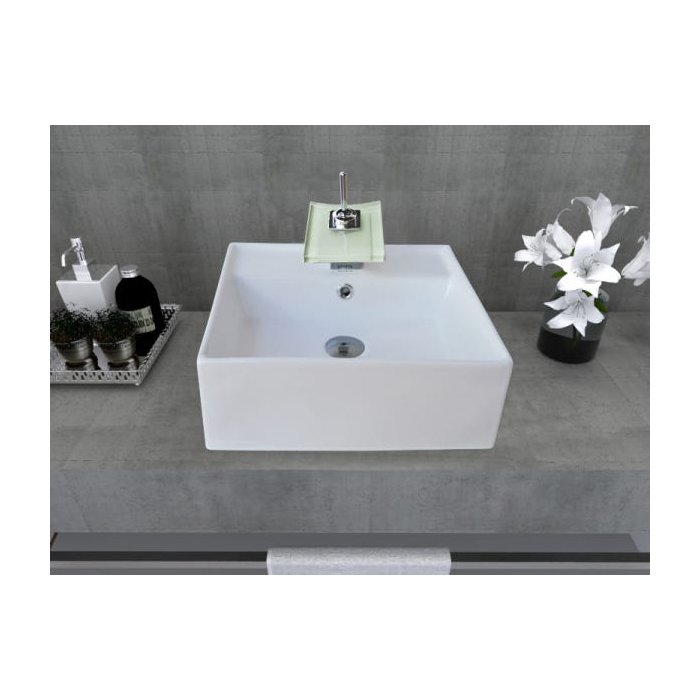 Cuba de Louça Quadrada Mesa, com Valvula Click, Sifao e Torneira Cascata Quadrada Branca