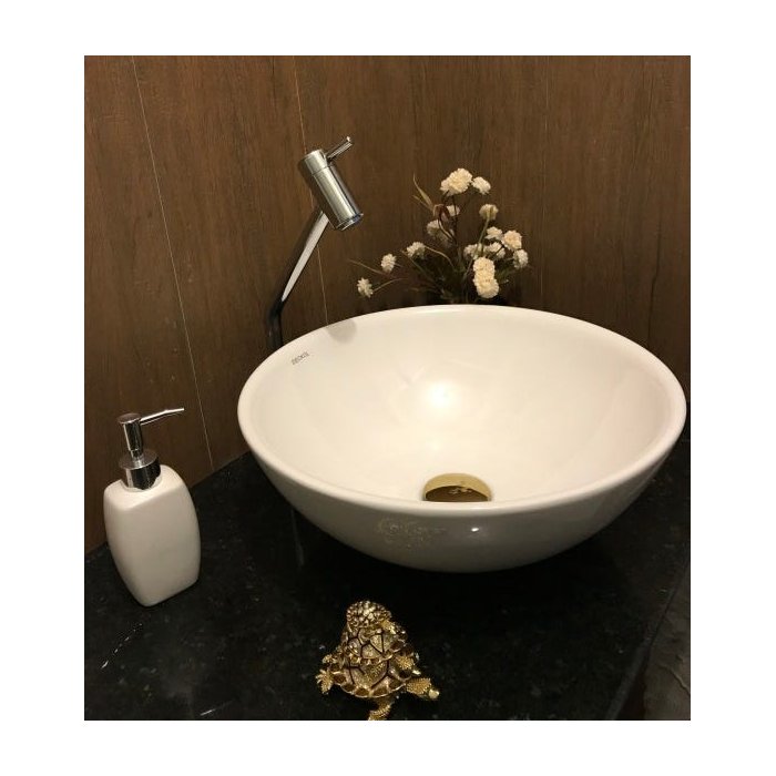 Cuba de louça redonda branca sobrepor+válvula dourada