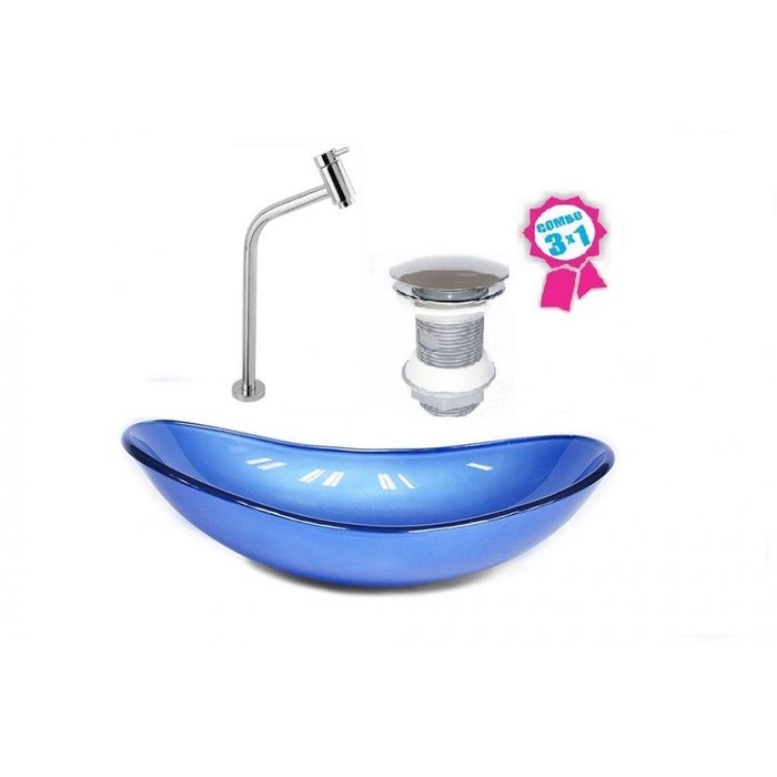 Cuba De Vidro 47cm Azul Válvula Click e Torneira De Metal Azul