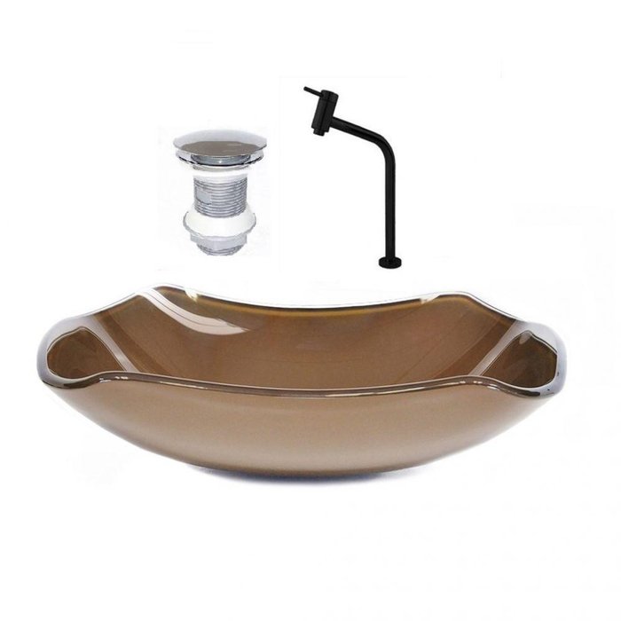 Cuba de Vidro 51cm Marrom + Valvula + Torneira Preta Marrom