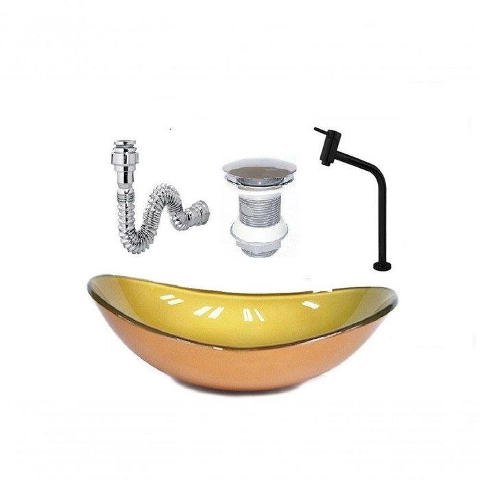 Cuba de Vidro Oval 47cm Dourado Real + Valvula + Torneira Preta + Sifao Dourado Real + Preta