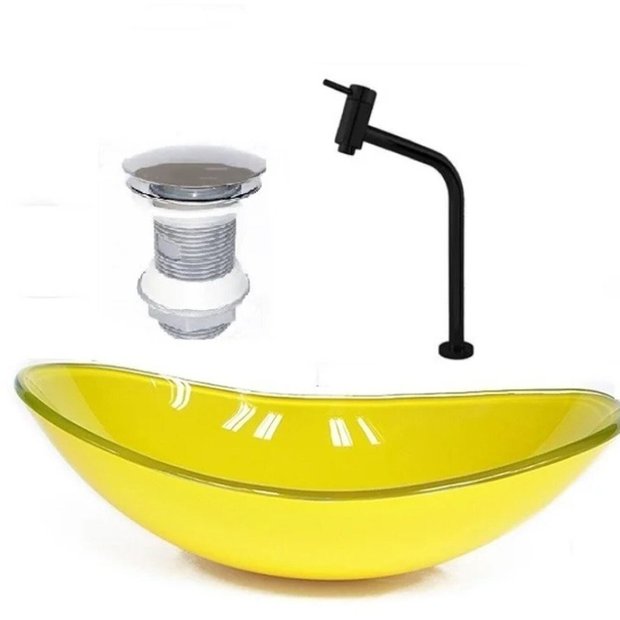 1 cuba de vidro oval 55cm amarela + valvula + torneira preta