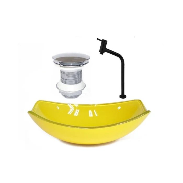 | Itens Inclusos | 1 cuba de vidro oval chanfrada 46cm amarela + valvula + torneira metal preta |