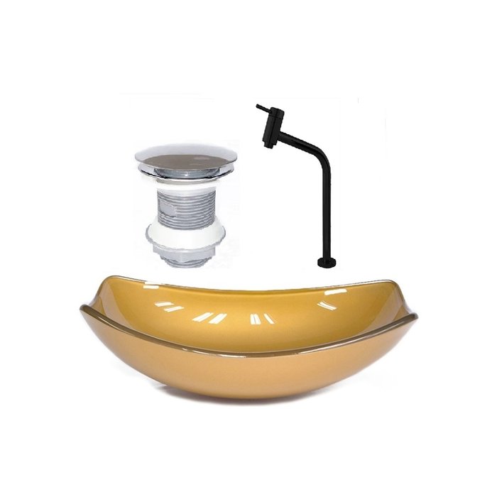 CUBA DE VIDRO OVAL CHANFRADA 51CM DOURADO REAL + VALVULA + TORNEIRA PRETA Dourado