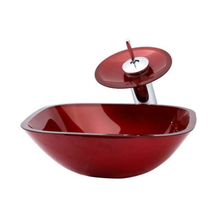 Cuba de Vidro Quadra 31 + Torneira Cascata + Válvula - Vermelho escuro