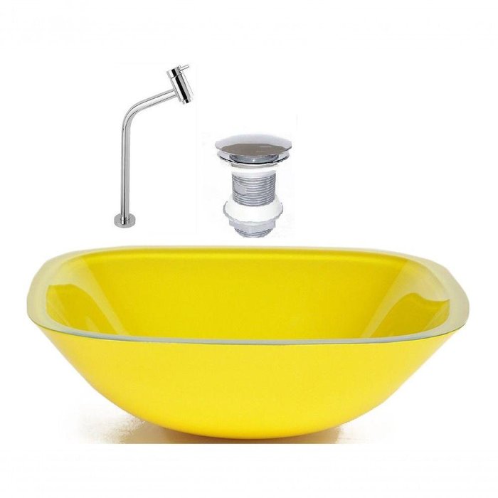 Cuba de Vidro Quadrada 35cm Amarela + Valvula + Torneira Amarela