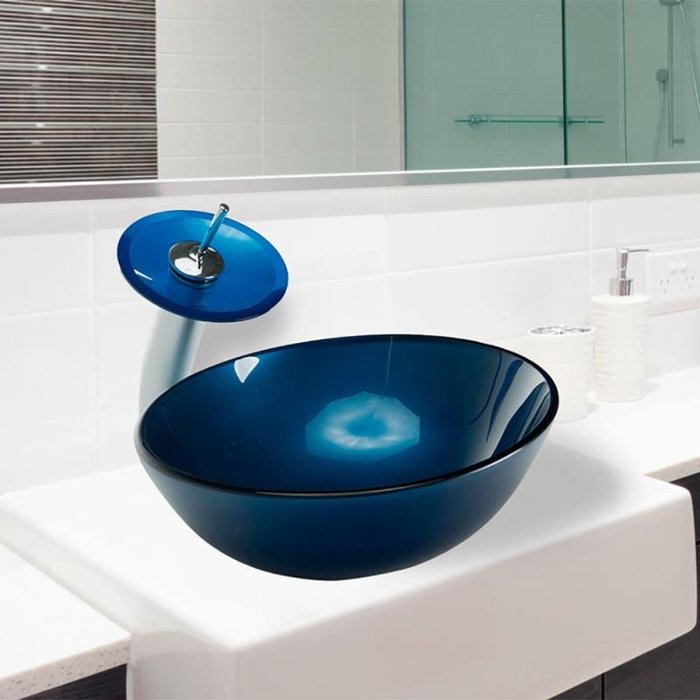 Cuba de vidro redonda 30 azul, válvula , sifao, cascata