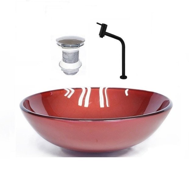 1 cuba de vidro redonda 31cm vermelho cereja + valvula + torneira preta