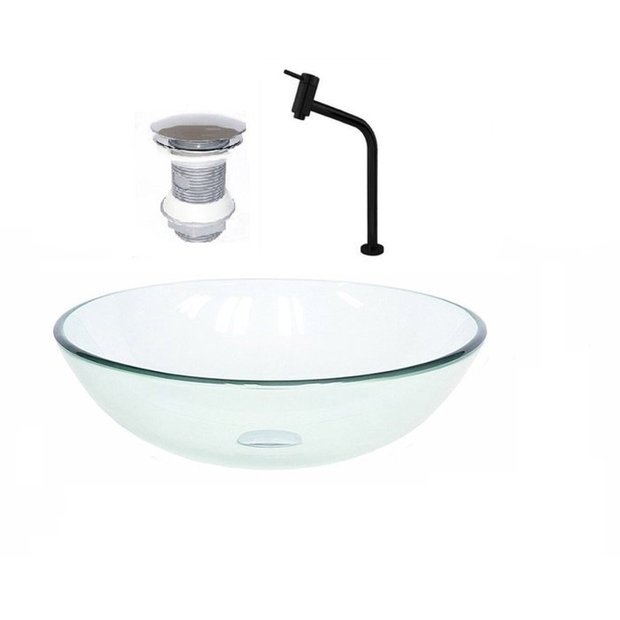 Cuba de Vidro Redonda 35cm + Valvula + Torneira Incolor