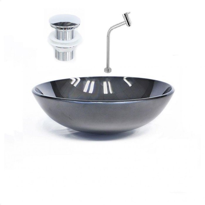 Cuba de Vidro Redonda 35cm + Válvula + Torneira de Metal Grafite