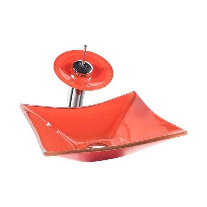 Cuba de Vidro Retangular Laranja + Torneira Cascata + Válvula Click