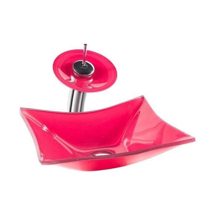 Cuba de Vidro Retangular Rosa + Torneira Cascata + Válvula Click